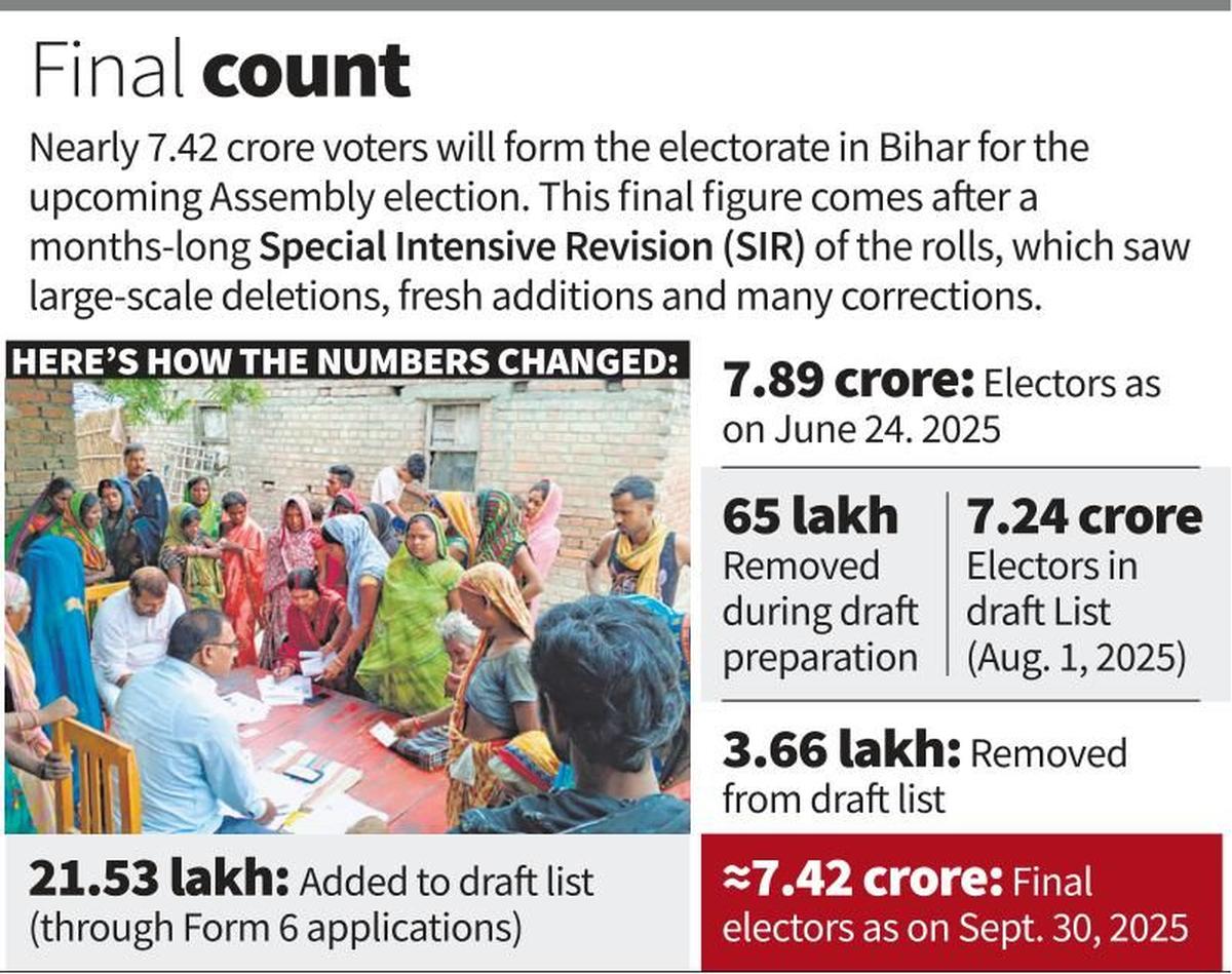 Ahead of the Assembly election in Bihar, the Election Commission on Tuesday released the final electoral rolls in the State with nearly 7.42 crore names on the completion of the special intensive revision of the list.